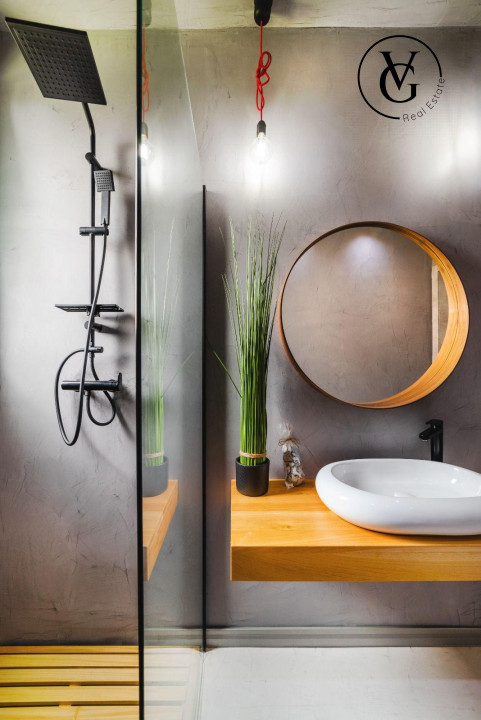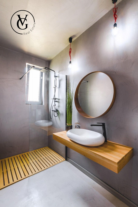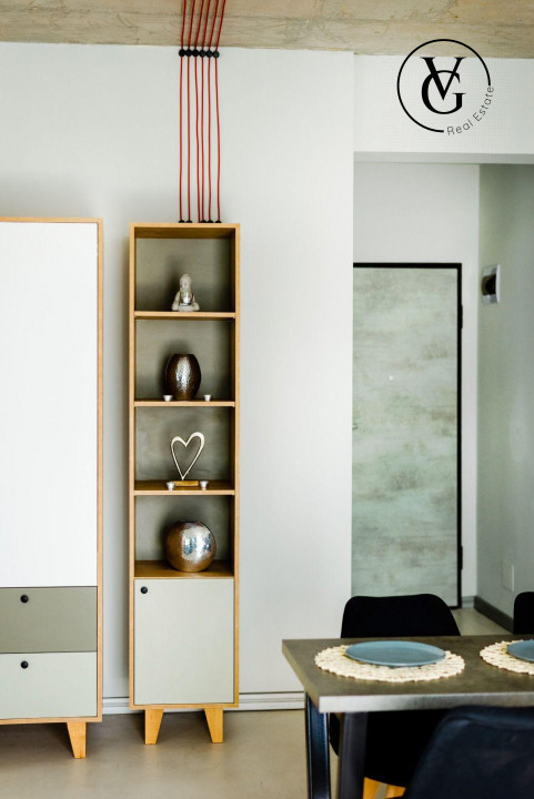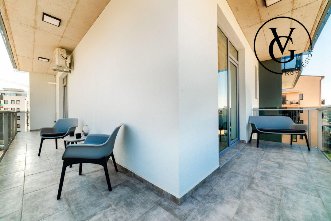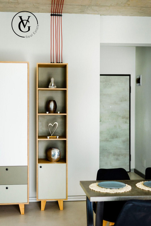 • Dotări și finisaje: încălzire în pardoseală, microciment, centrală termică, aer condiționat, plită cu inducție, mașină de spălat haine, mașină de spălat vase, frigider, filtru de apă potabilă, cuptor cu microunde, aparat de cafea, smart TV, internet, cablu, instalație electrică premium, aspirator, uscător de păr, uscător de rufe, mobilă de bucătărie, canapea extensibilă în living, mobilă de dormitor, două dulapuri mari, mobilier de terasă