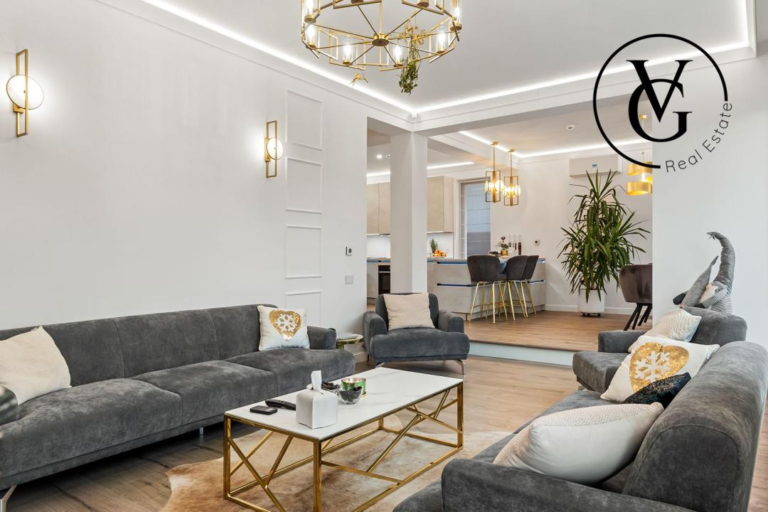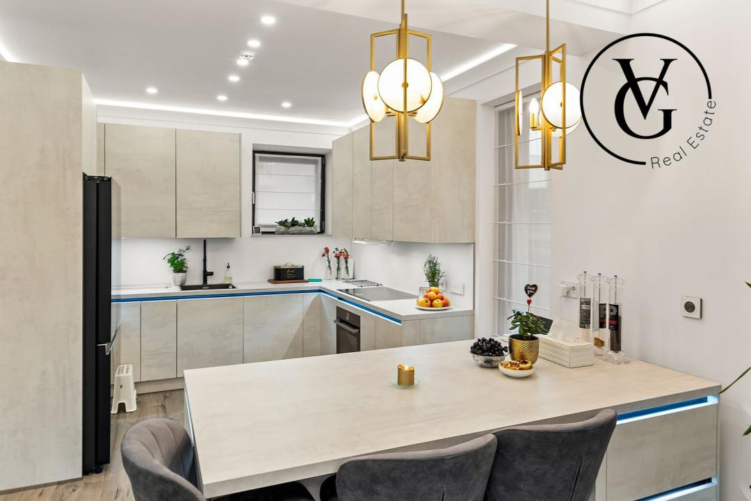 Bucataria moderna, deschisa, este complet echipata si include un frigider de vinuri integrat in insula. Impreuna cu zona de dining, formeaza un spatiu generos de 27,5 mp, perfect pentru socializare.