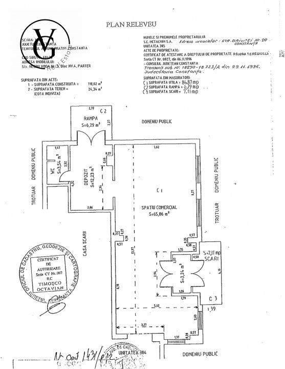Spre achizitie , spatiu comercial in suprafata construita de 242 mp, rezultat din alipirea a doua spații în suprafață utila de 93,08 mp + 84,87 mp, prevăzute cu scări și rampa de acces , doua ieșiri .